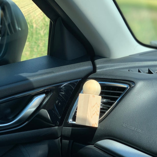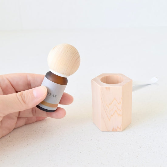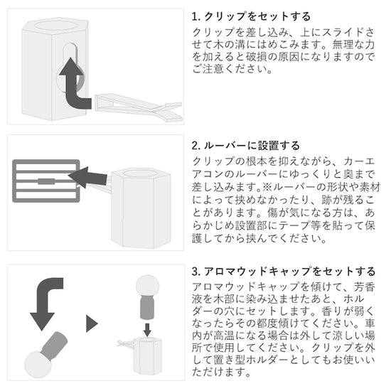 3.アロマウッドキャップをセットするアロマウッドキャップを傾けて、芳香液を木部に染み込ませたあと、ホルダーの穴にセットします。香りが弱くなったらその都度傾けてください。車内が高温になる場合は外して涼しい場所で使用してください。