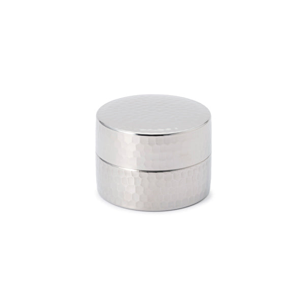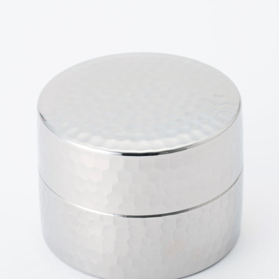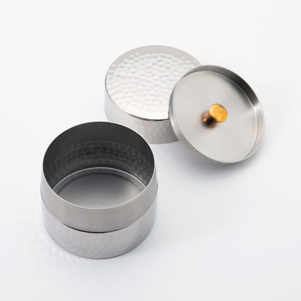 • 鎚目模様が施されたステンレス製の茶筒。茶葉が隙間に入り込まず清潔にお使いいただけます。