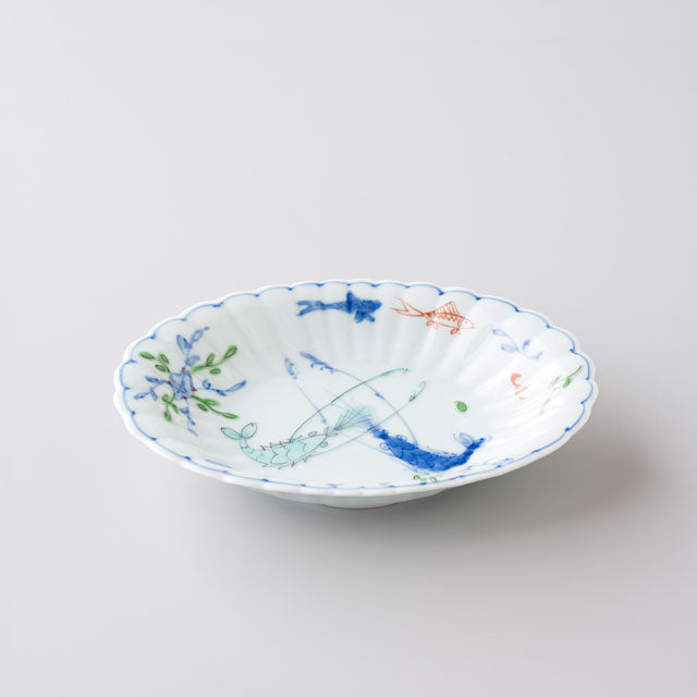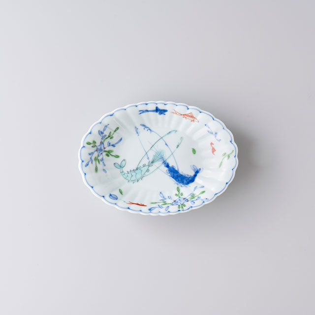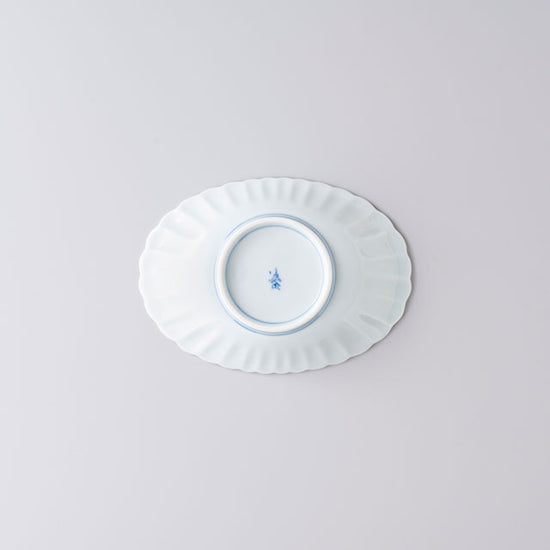 2匹が寄り添うように対になった姿が印象的な「双海老(つがいえび)」。繁栄や長寿の願いを託した、縁起の良いモチーフのひとつです。「つがいえび」の読み名からわかるように、「ずっと夫婦仲良く健康で」というメッセージも込められています。楕円で菊渕をあしらったデザインが特徴です。カットしたフルーツやデザートなどちょっとしたお料理が食卓を華やかにします。取皿としても大活躍します。