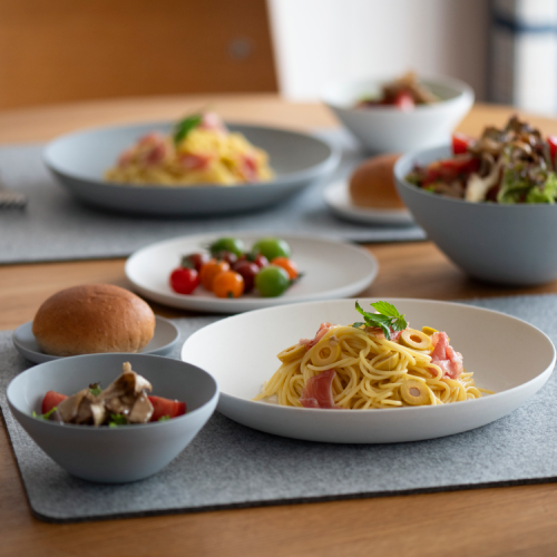 2色のうつわをまぜて使用すると、テーブルの上に華やかさをもたらします。