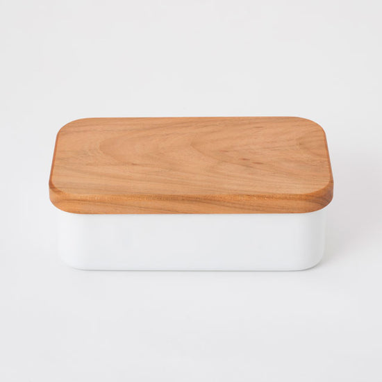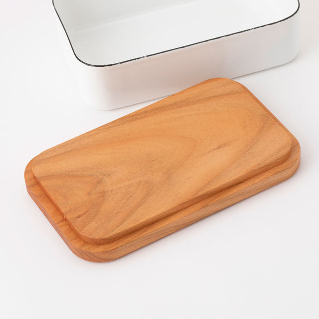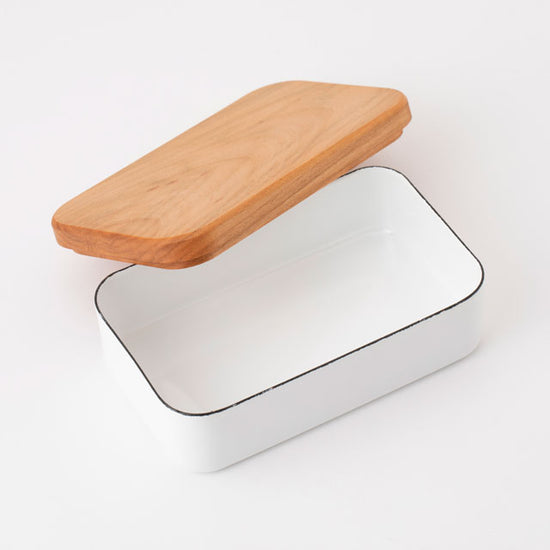 白いホウロウに天然木蓋の組み合わせが魅力のバターケース。においうつりがなく、冷却性の高いホウロウはお手入れもしやすく、バターの保存にも適している材質です。温かみのある自然な風合いの天然木(桜)蓋の組み合わせがつかうたびに嬉しくなります。本体ごとひっくり返し木蓋をバターのカッティングボードにする事もできます。