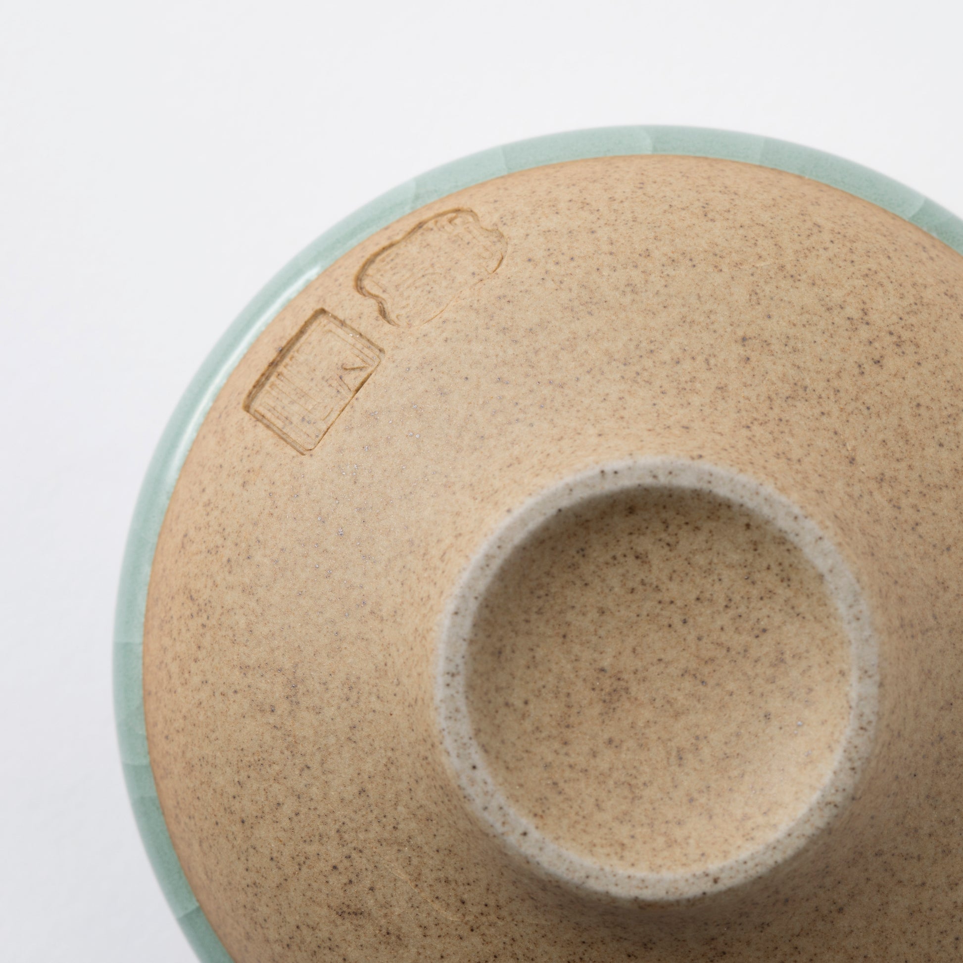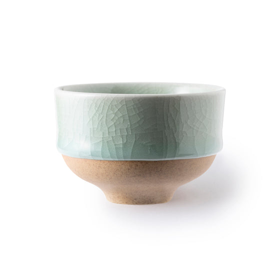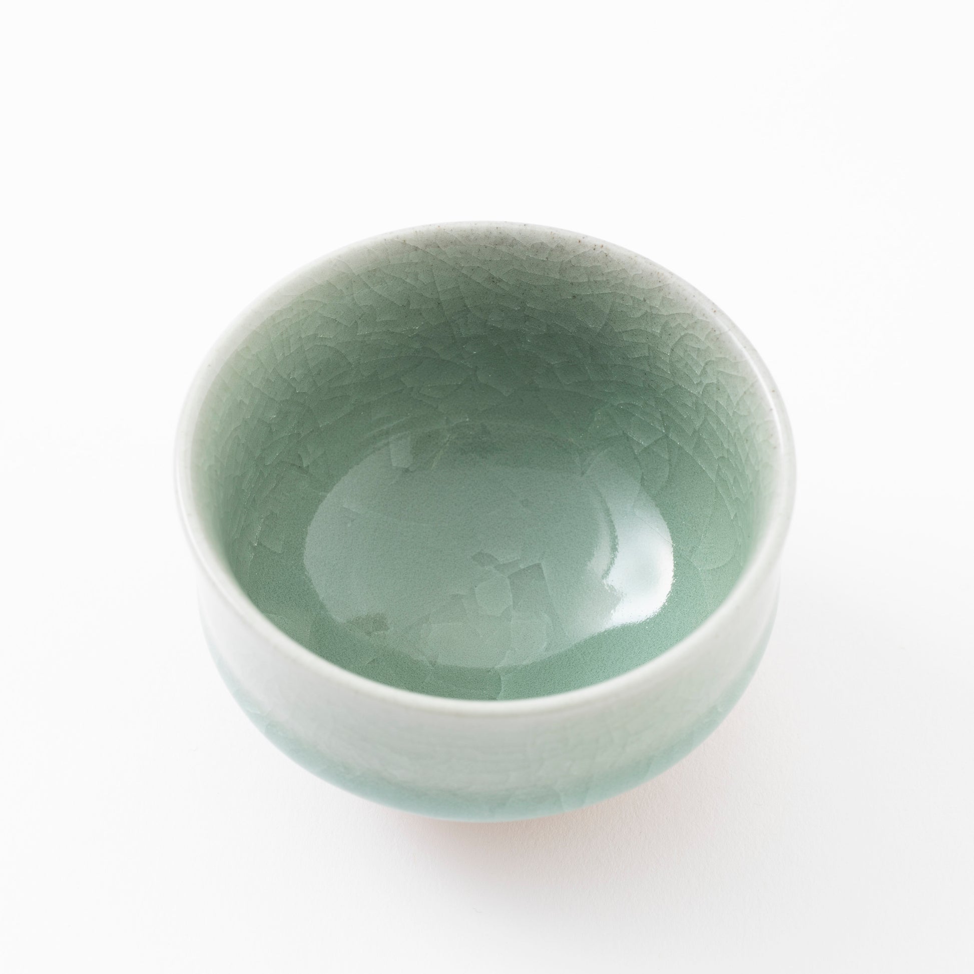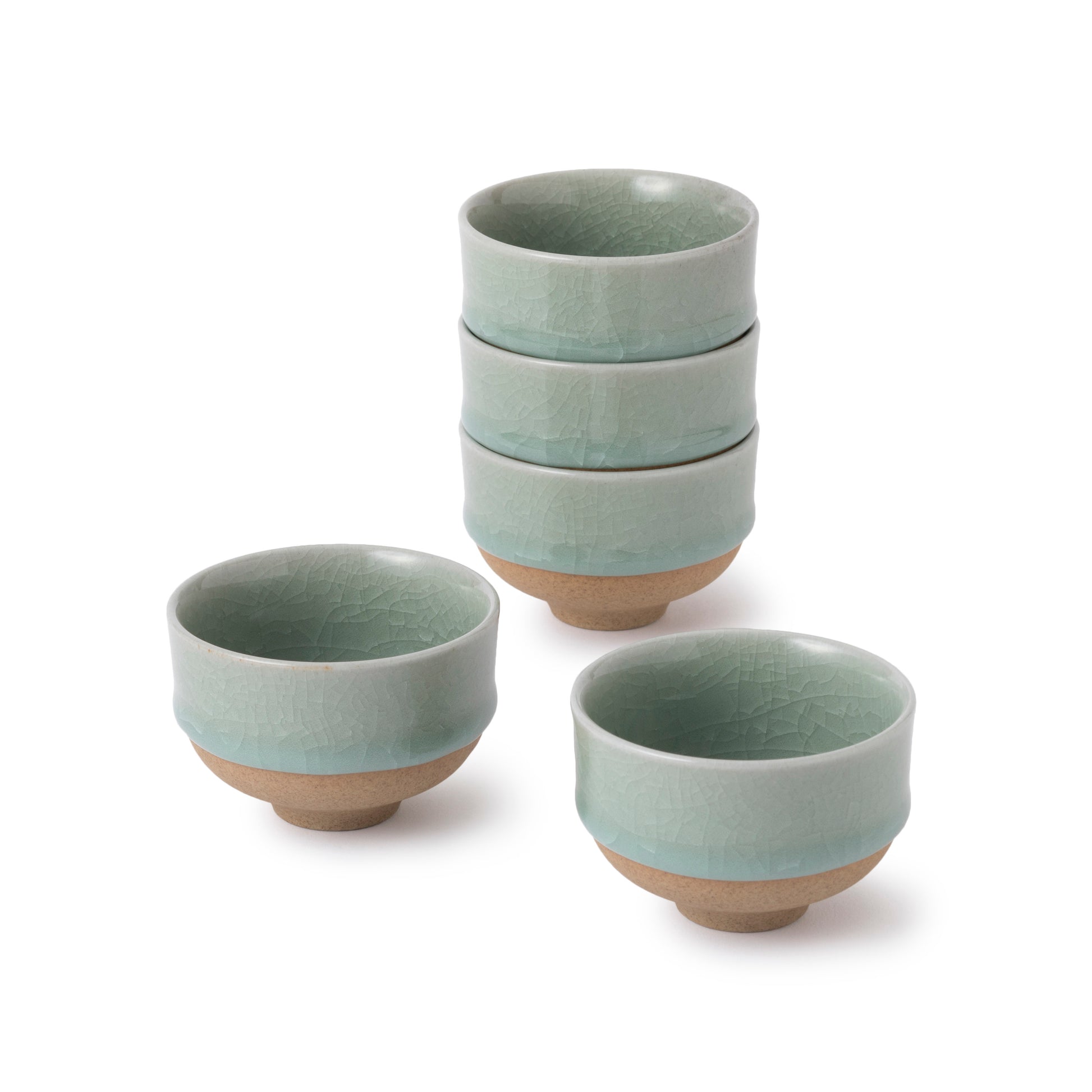 鍋島焼の窯元・虎仙窯による貫入煎茶碗 5個入です。陶土と青磁釉との収縮率の違いを利用してつくる貫入が特徴で、青磁釉には伊万里市大川内山でしか産出されない純度の高い青磁原石が用いられています。マットな素地とつややかな釉薬との対比が美しく、釉薬の厚みがそのままスタッキングの機能をはたしています。