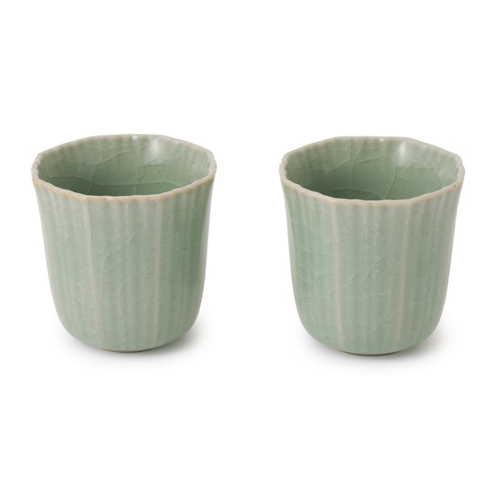 佐賀県伊万里市で鍋島焼・伊万里焼の伝統と技術を守り続ける窯元「虎仙窯」が手掛けた猪口のペアセット。1640年代、鍋島藩が技術習得のため職人に写しをつくらせていた中国・景徳鎮の「色絵山水竹鳥文輪花大皿」をモチーフに断面の細工形状を製作。外形はただのストライプの細工ではなく、輪花の断面をエンボスとして立体的に表現しています。陶土と青磁釉との収縮率の違いを利用してつくる貫入が特徴で、青磁釉には伊万里市大川内山でしか産出されない純度の高い青磁原石が用いられています。