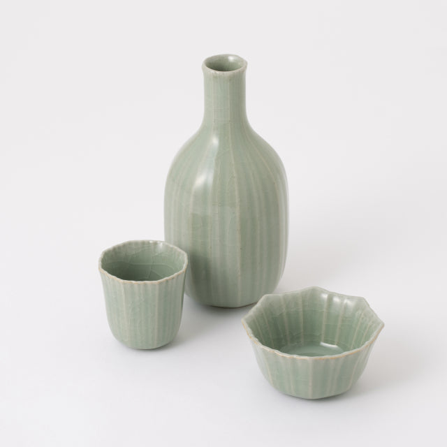 鍋島焼の窯元・虎仙窯がつくる鍋島青瓷の徳利・猪口・小鉢を1客ずつ収めた酒器セットです。酒器はすべて1640年代に鍋島藩が技術習得のため職人に写しをつくらせていた中国・景徳鎮の「色絵山水竹鳥文輪花大皿」をモチーフに断面の細工形状を製作。外形はただのストライプの細工ではなく、輪花の断面をエンボスとして立体的に表現しています。陶土と青磁釉との収縮率の違いを利用してつくる貫入が特徴で、青磁釉には伊万里市大川内山でしか産出されない純度の高い青磁原石が用いられています。