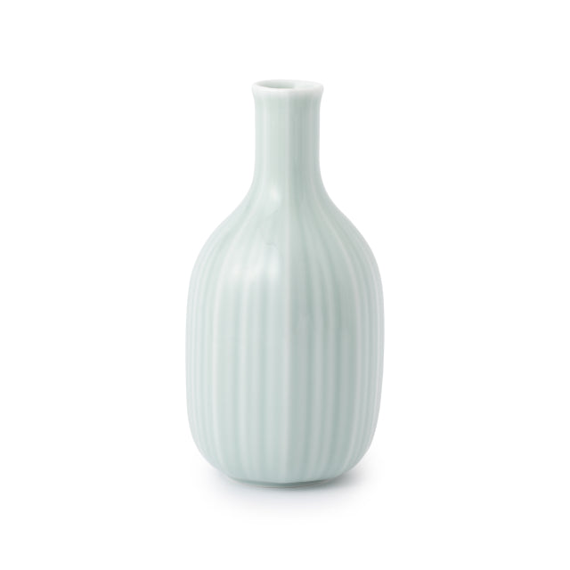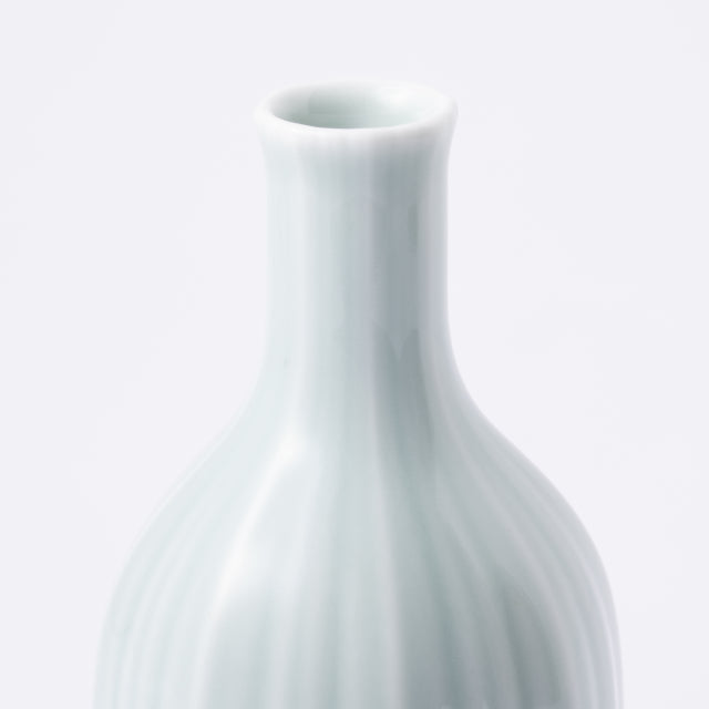鍋島虎仙窯がつくる、鍋島青磁の徳利です。徳利は1640年代、鍋島藩が技術習得のため職人につくらせていた中国・景徳鎮の「色絵山水竹鳥文輪花大皿」をモチーフに断面の細工形状を製作。外形はただのストライプの細工ではなく、輪花の断面をエンボスとして立体的に表現しています。底には細やかな高台を設け、鍋島焼らしい格の高さとエレガントさを演出しています。