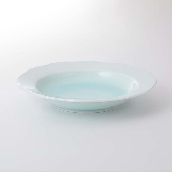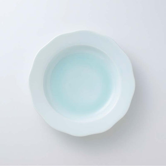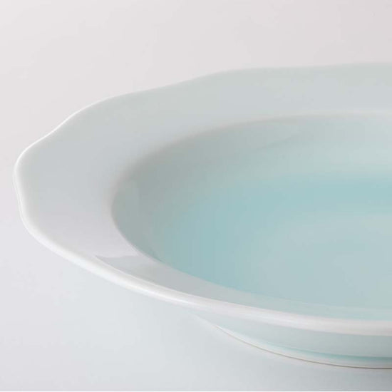 佐賀県伊万里市で鍋島焼・伊万里焼の伝統と技術を守り続ける「鍋島虎仙窯」が手掛けたスープ皿です。スープとしてはもちろん、ロールキャベツや朝食のシリアルにもぴったりなお皿です。釉薬は淡く青みがかった水色が特徴の青白磁という釉薬を施しています。 透明感のある優雅な色合いはお料理を引き立ててくれ、どんな料理も上品に見せてくれます。