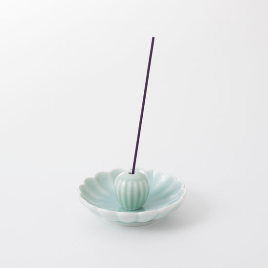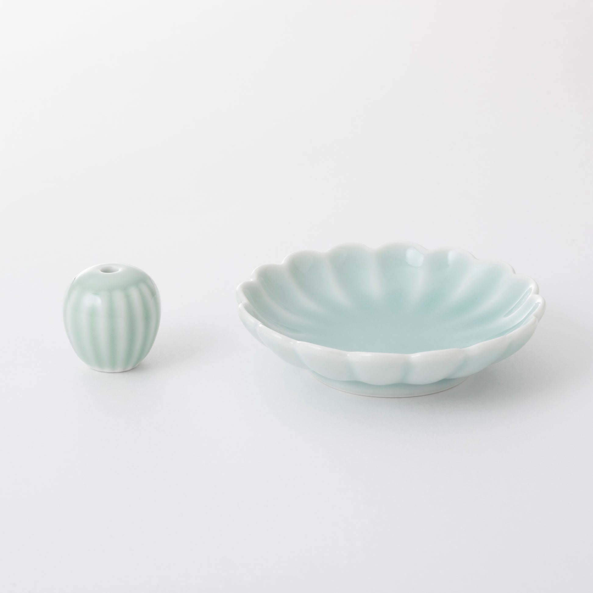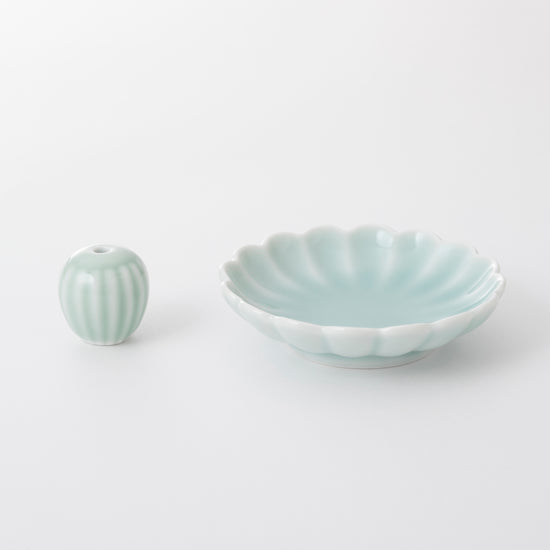 • 青白磁を施した優雅な色合いの香立と受け皿のセットです。