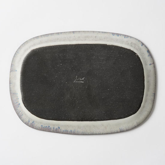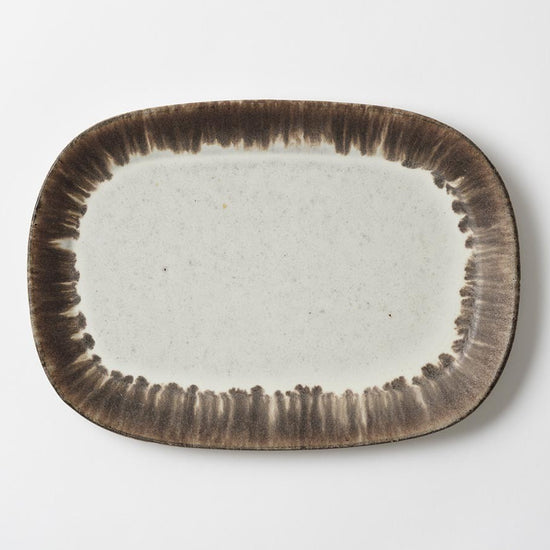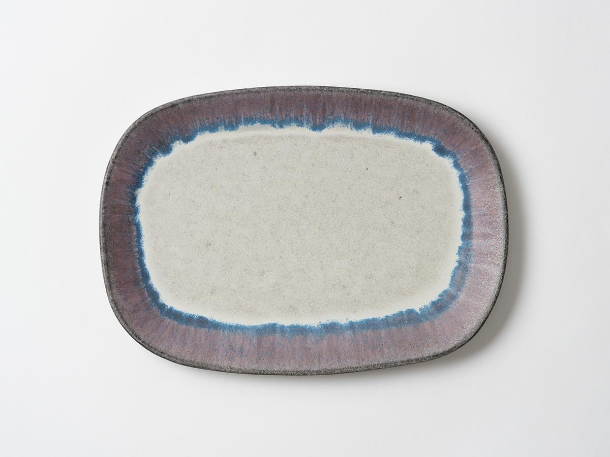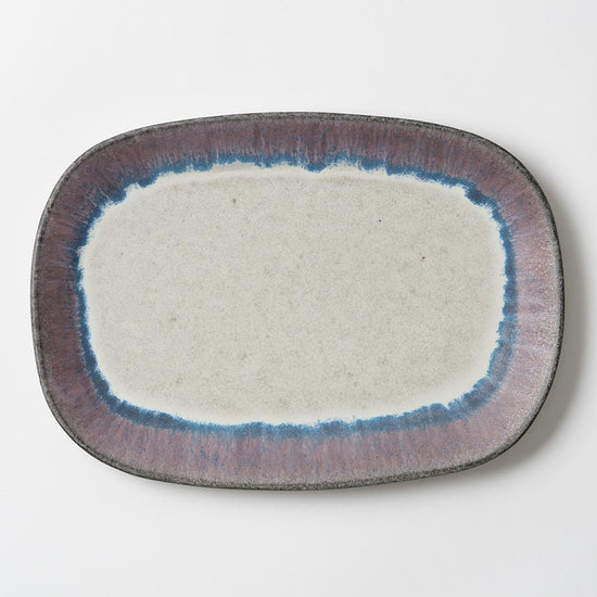 ブルーとブラウンの2色展開で、お皿の縁に施した釉が焼成時に窯の中で溶け、美しい色彩の模様を描いています。すべて手作業で作陶しているため、一つとして同じものがない形や風合いをお楽しみいただけます。