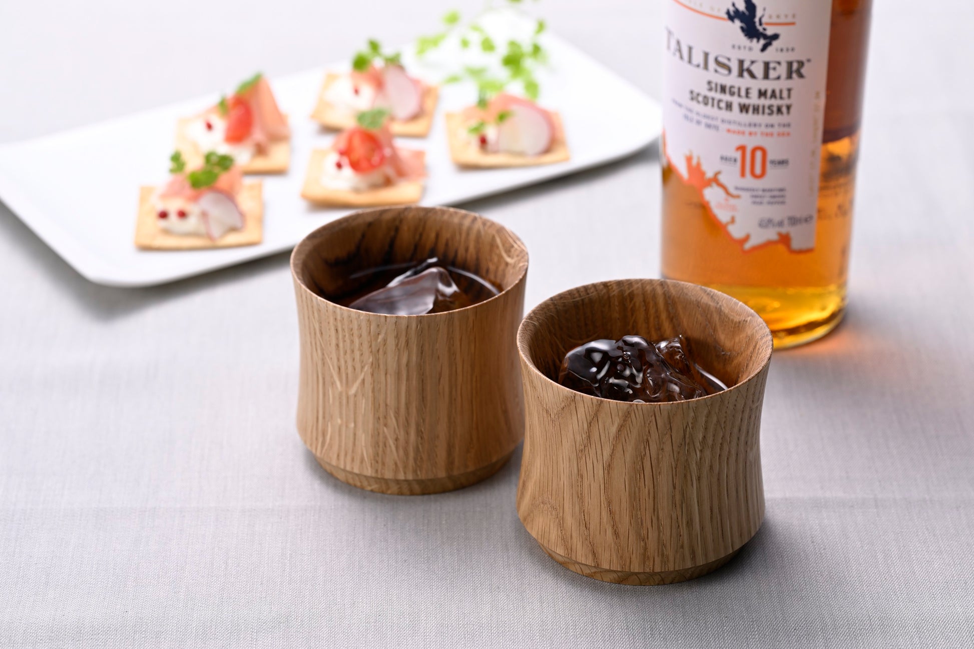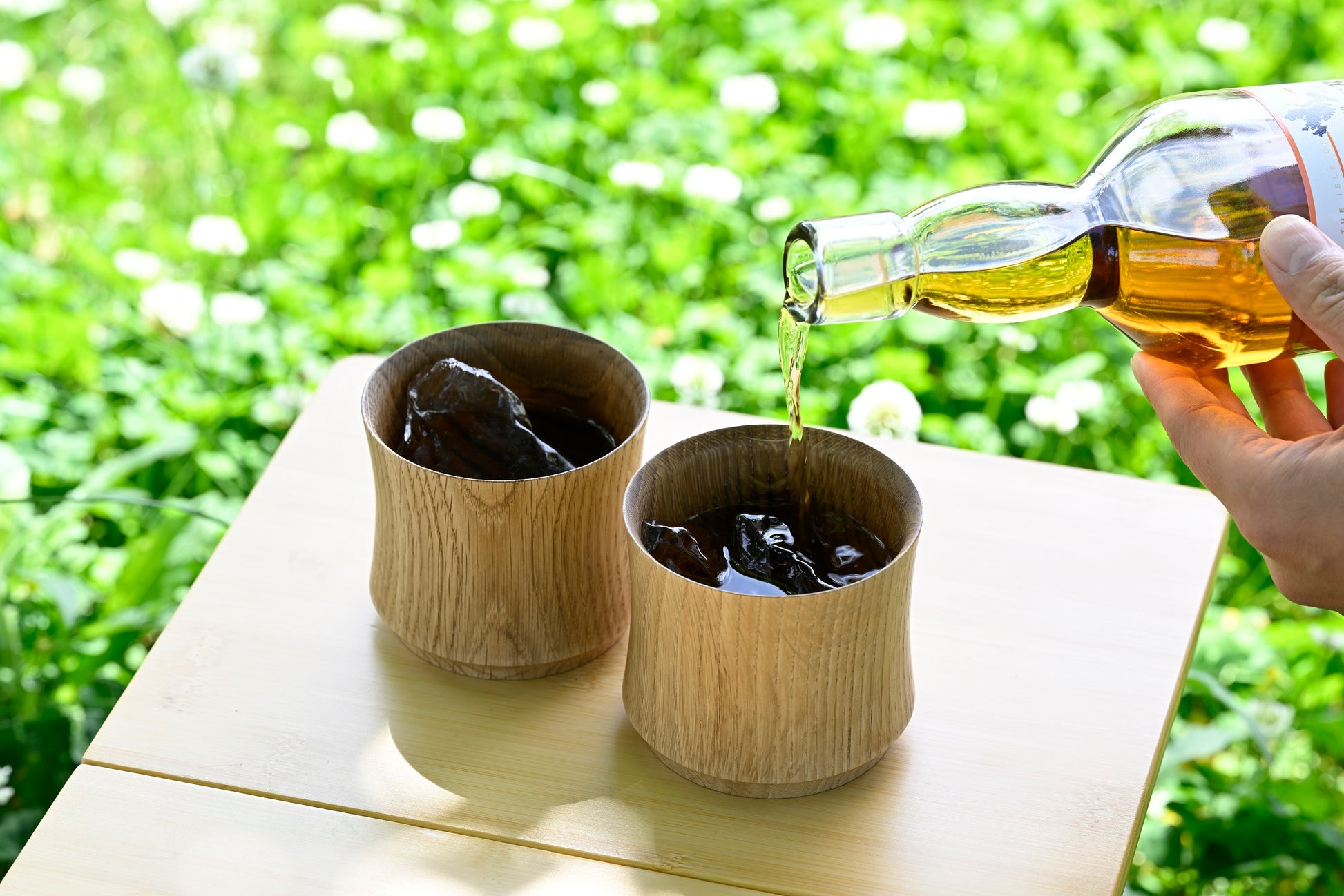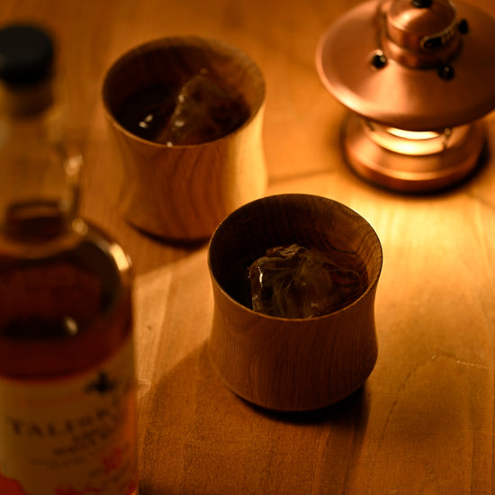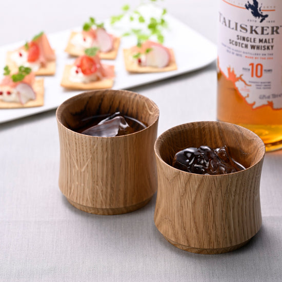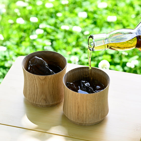 〔樹盃 Mizunara〕は深くスモーキーな天然木のかぐわしさ、ゆらめく木目の表情、なめらかな口あたりを愉しむ酒器です。