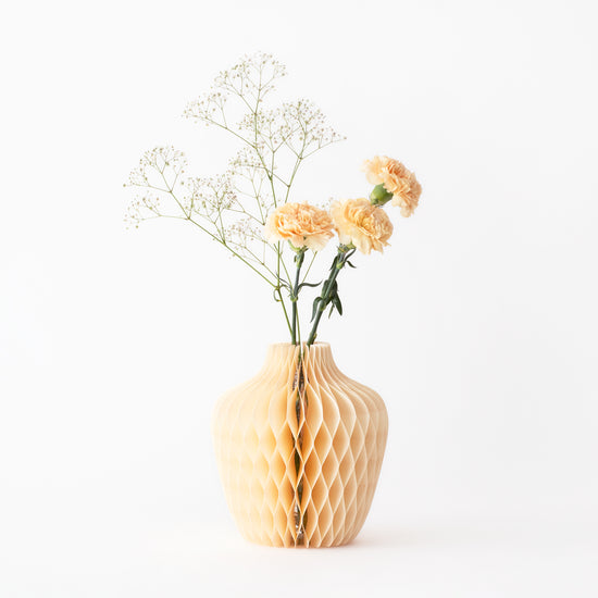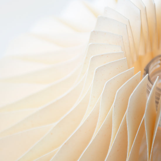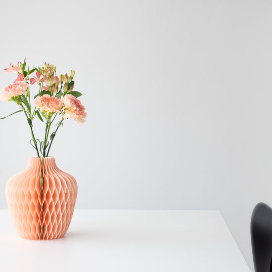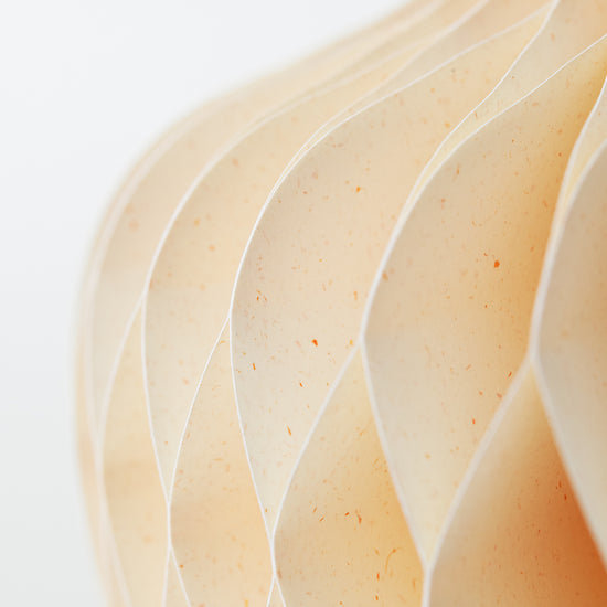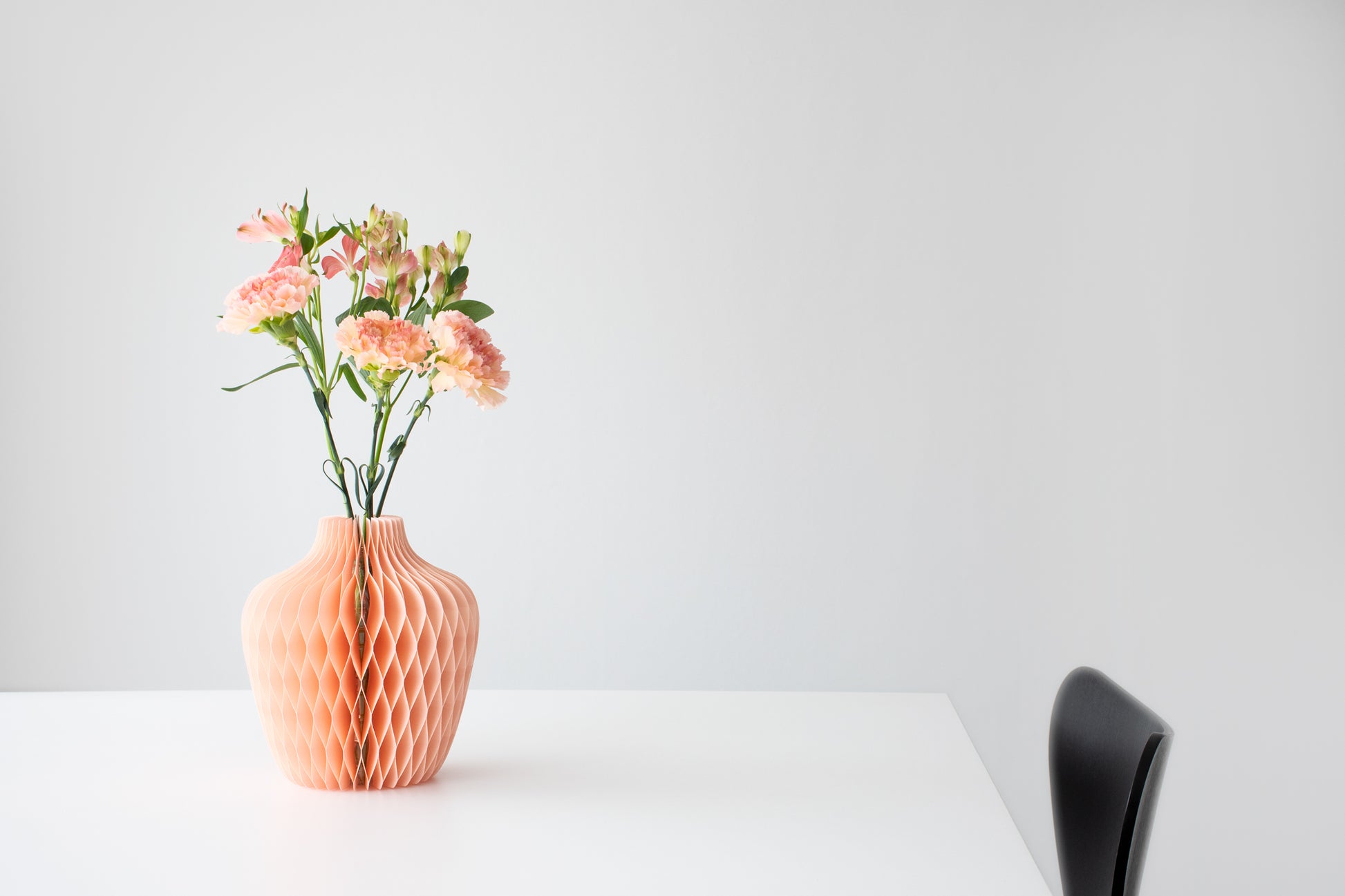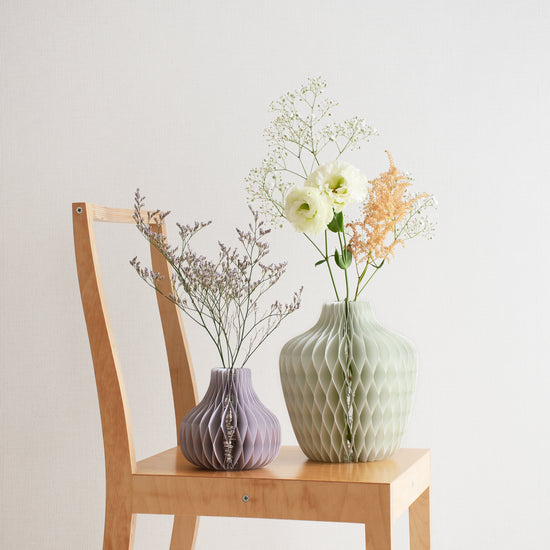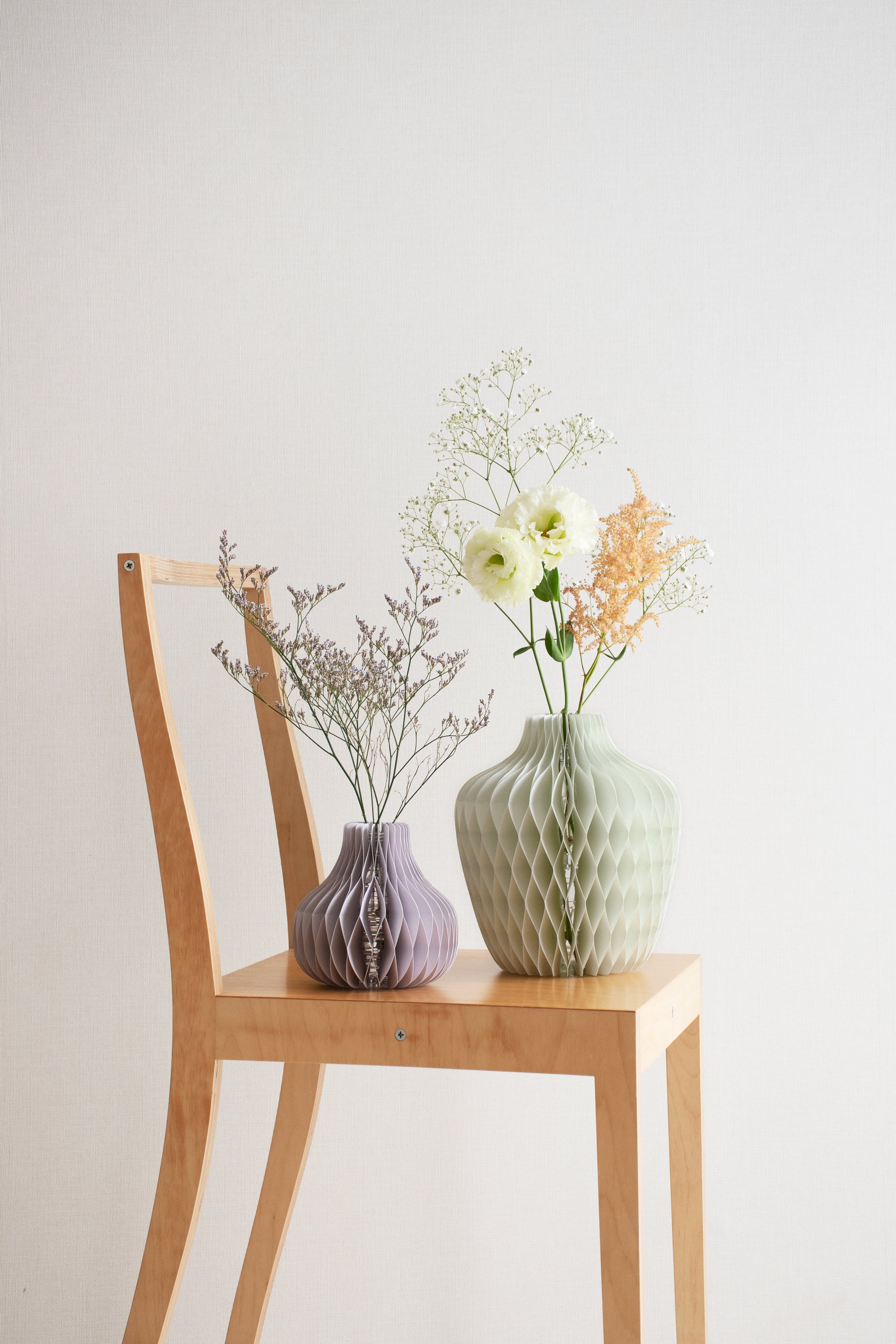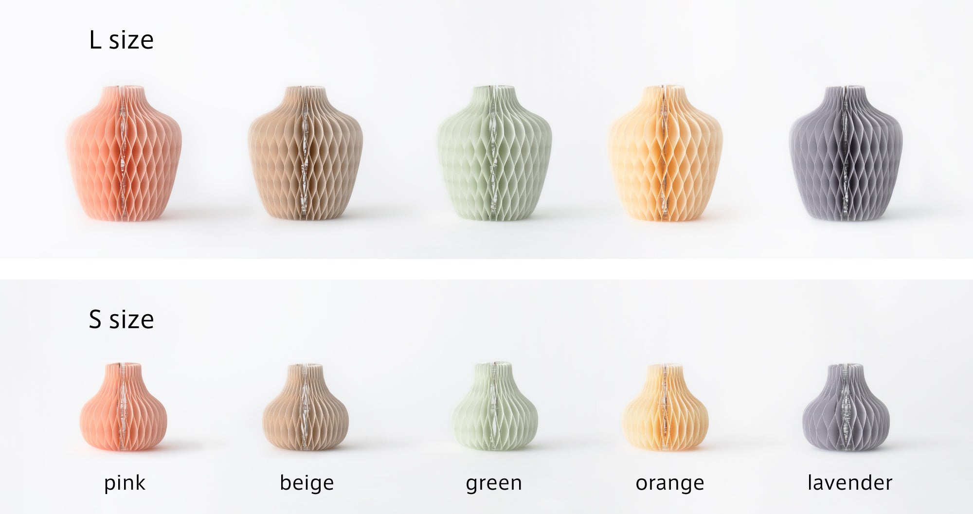 紙独自の質感が、既存のフラワーベースには無い雰囲気を作ります。柔らかなカラー展開でどんなインテリアにもマッチします。グリーンとオレンジは粒のような細かな模様が入っているのも紙ならではです。