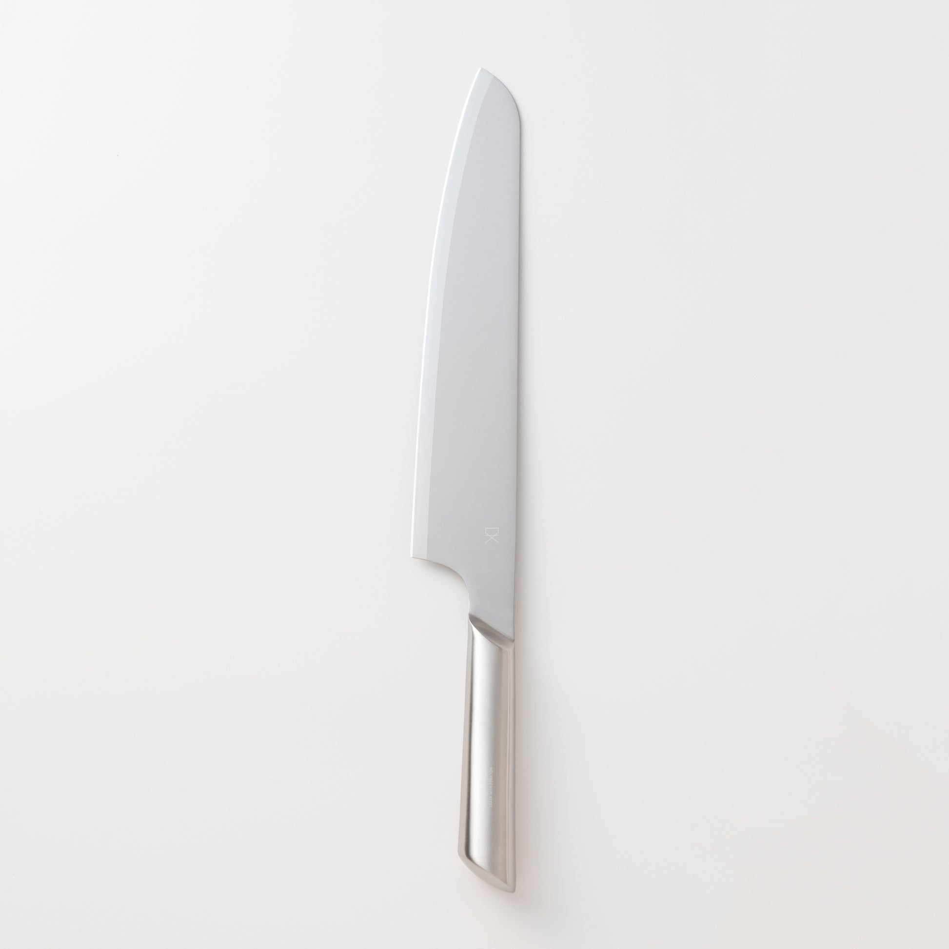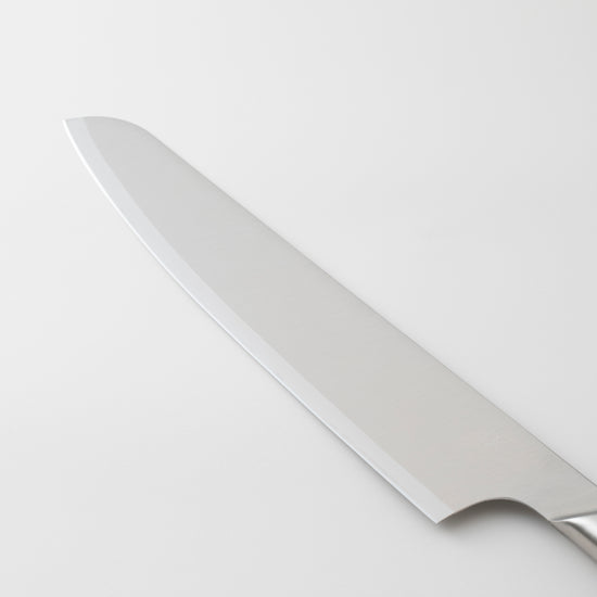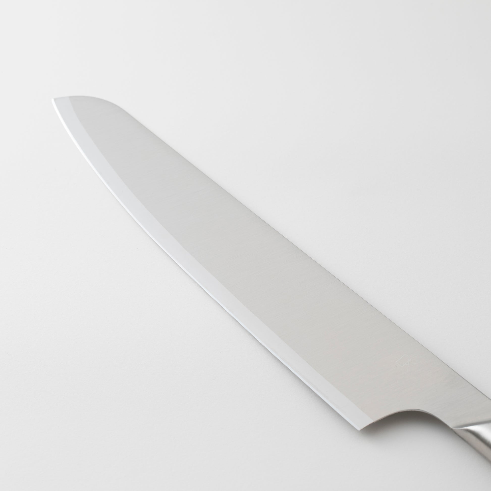 大きな肉や、鱗や太い骨鱗のあるなど、固く大きな食材に適した牛刀。長く鋭い刃は、料理のレベルをワンランクアップしてくれるでしょう。独自の丸みを帯びたハンドルは、美しいだけでなくしっかりと握れるこだわりの設計。力が入りやすいため食材が滑りにくく、固い食材も得意です。