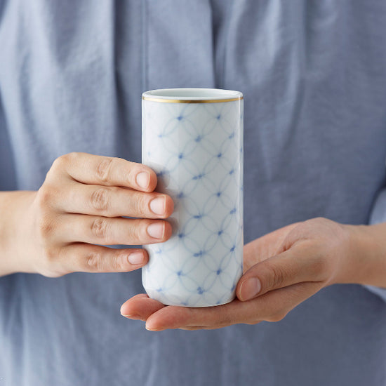 高い焼成温度で焼き締められた有田焼の薄く滑らかな白い磁肌に、「波」「七宝」「麻の葉」といった縁起の良い吉祥文様をベースとした絵付けが、寛ぎのひと時を優しく演出します。