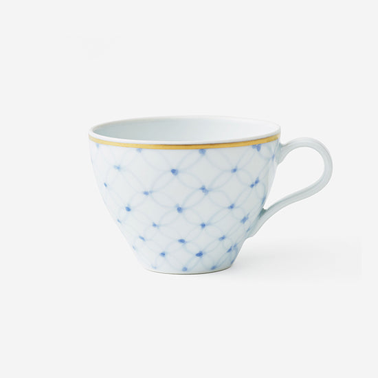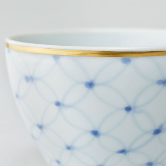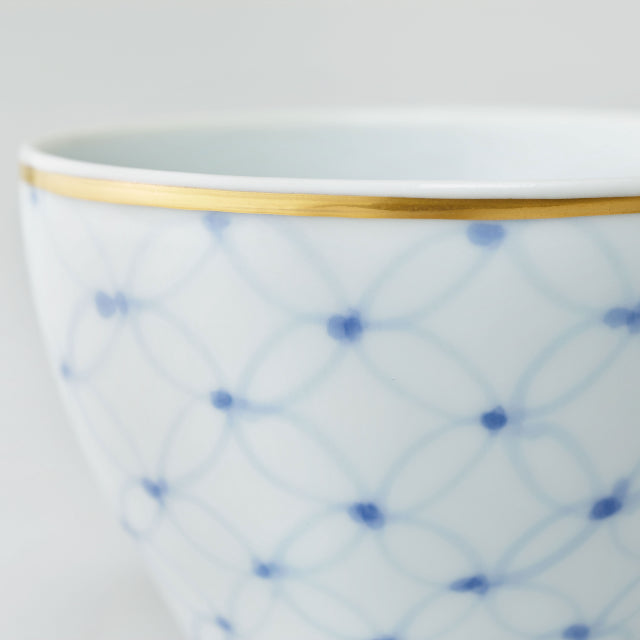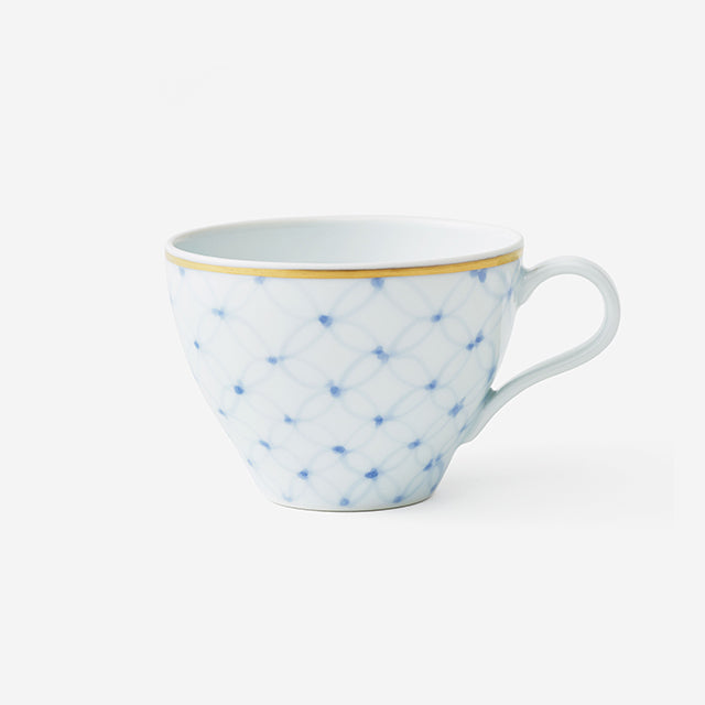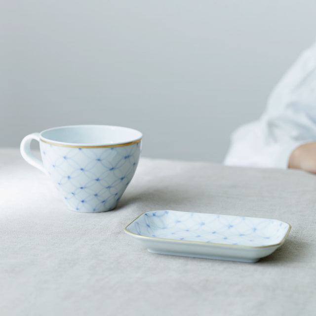 高い焼成温度で焼き締められた有田焼の薄く滑らかな白い磁肌に、「波」「七宝」「麻の葉」といった縁起の良い吉祥文様をベースとした絵付けが、寛ぎのひと時を優しく演出します。