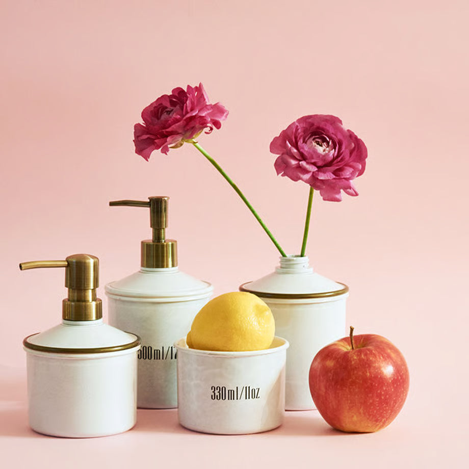まるで陶器のような佇まいの樹脂製のハンドソープ泡用ディスペンサー。