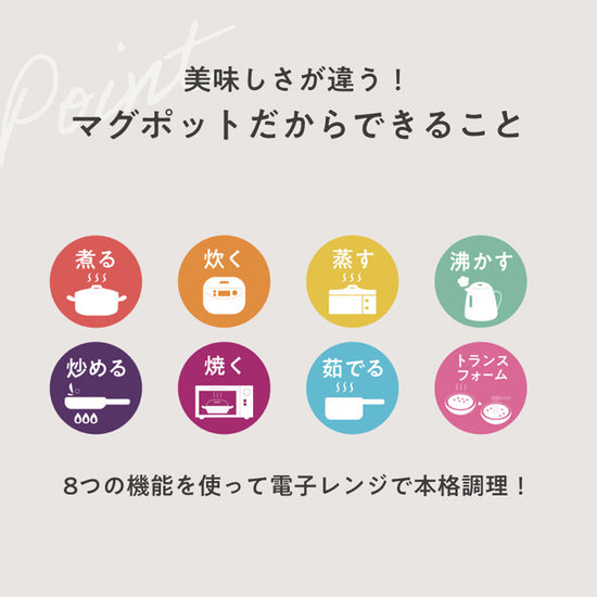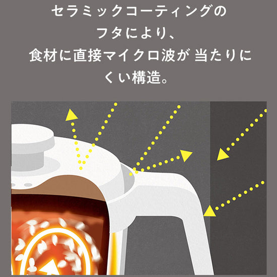 - 電子レンジで「煮る・蒸す・茹でる」が手軽にできるマグカップ型の調理器
