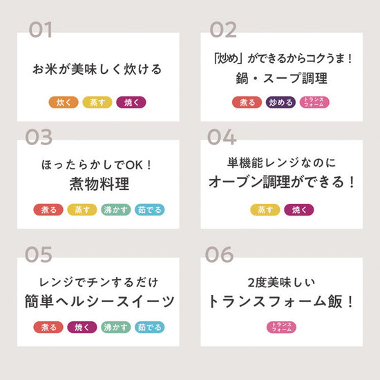 火を使わずに、コク旨スープや煮物・スイーツ、短時間でお米も美味しく炊くことができます。