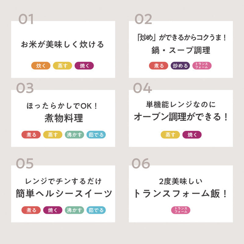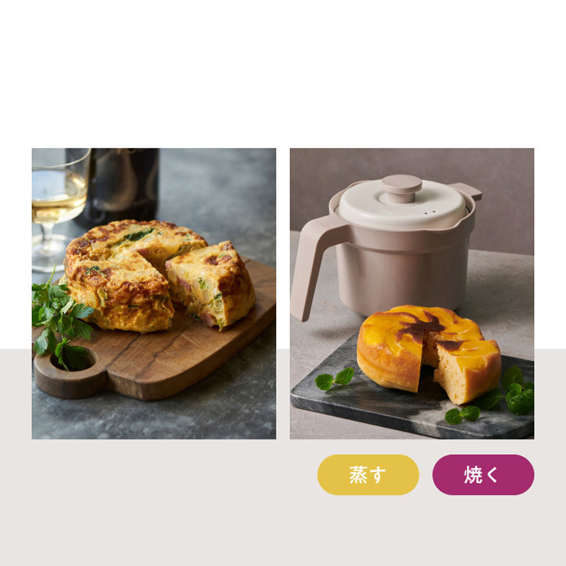 3.単機能レンジでオーブンのような調理ができる:分厚いホットケーキやスパニッシュオムレツなど、オーブン調理や型が必要なレシピも簡単に作ることができます。