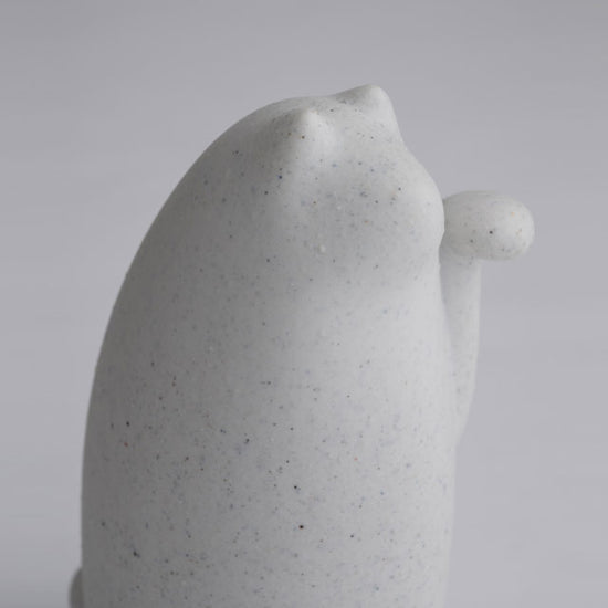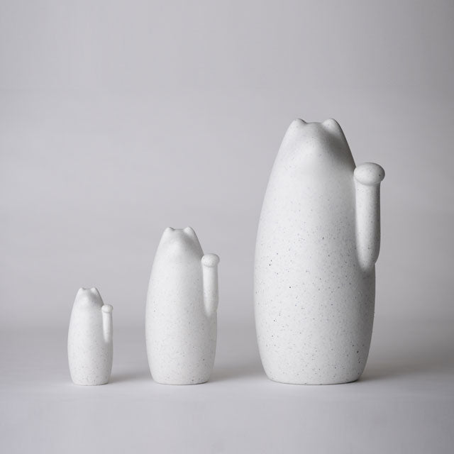 SETOMANEKI earth シリーズは、廃棄された陶磁器を粉砕し、瀬戸のきめ細かく粘り気のある陶土と混ぜ合わせて成形しています。あえて粒感が残るように粉砕したことにより、これまでにない質感や風合いを持つ招き猫に仕上がりました。表面のほのかな起伏は、どこかラフでざっくりとした印象で、SETOMANEKIのシンプルな形をより引き立てています。