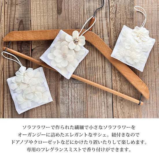 ソラフラワーで作られた繊細で小さなソラフラワーをオーガンジーに詰めたエレガントなサシェ。紐付きなのでインテリアとして、クローゼットなどにかけたり置いたりして楽しめます。専用のフレグランスミストで香り付けができます。