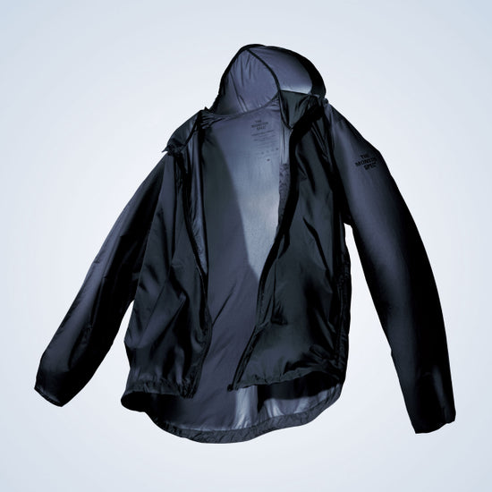 この生地に使われているナイロン糸の細さは、わずか6.5D(デニール)。なんと髪の毛の約8分の1に当たります。極細糸を織り込むことで、世界一軽く、薄く、密度が高いため風を通しにくい生地になっています。製品総重量は、Mサイズで約82g。一般の半袖Tシャツと比べて、約3分の1の軽さです。また、軽さにこだわりながらも、左右にハンドウォーマーポケットを配し、フードや裾にはシンプルで扱いやすいドローコードを備えることで、携帯性と高いユーザビリティを両立しています。