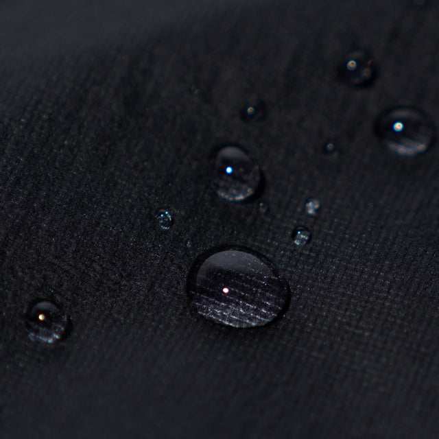 ※撥水とは「水を弾く」こと。対して、防水は「水を通さない」ことを指します。撥水加工は、布地の表面をシリコンでコーティングすることで、水を玉状にして弾きます。繊維同士の隙間が残るため、空気や蒸気などの気体は布面を通り抜けて、蒸れにくいというメリットがあります。反面、霧雨のように小さい水滴や勢いのある強雨は、繊維同士の隙間から中に浸透してしまうこともあります。一方、防水加工は、生地に水を通さないフィルムを貼り付けたり、繊維同士の隙間をパラフィンなどで埋めたりすることで、水の浸透を防ぎます。霧雨でも強雨でも、水が染み込むことはありませんが、撥水加工とは違って繊維同士の隙間がないため、蒸れやすいという弱点があります。