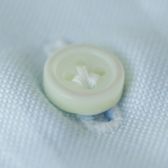 襟と袖には、服の型崩れを防ぎ、張りを持たせるため、高級シャツにのみ使用される「フラシ芯」を使用。「フラシ芯」は縫製が難しく、技術が高くないと縫えない芯地ですが、シャツに適したほどよい硬さを持ち、首や手首に馴染みます。ボタンは、熱に強く変化が少ない貝ボタン(高瀬貝)を選択。貝ボタンは、すべりにくくボタンが留めやすいことも特長です。掛け外しがスムーズに行えるよう、ボタンを少しだけ傾けて取り付ける「鳥足付け」という技術を採用しています。この取り付け方ができる専用機械は、日本国内でもごくわずかです。