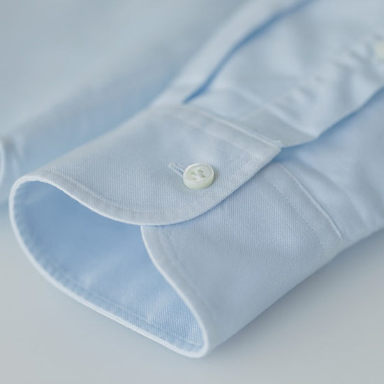 綿のカシミアとも称されるスーピマコットンを使ったオックスフォード生地は、通気性と柔らかさを実現するために、横糸に、縦糸の倍以上の太さがある糸を1本織り込む工夫をしています。さらに、より肌になじむように製品洗いを施し、自然な風合いに仕上げました。身幅をほんの少し細めに、着丈も少し短くしているので、ノーネクタイでズボンの上に出すようなカジュアルな着こなしも似合います。