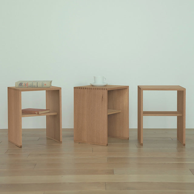 - 北米産ホワイトオークの無垢材を使った日本製のコンパクトな木製スツール。