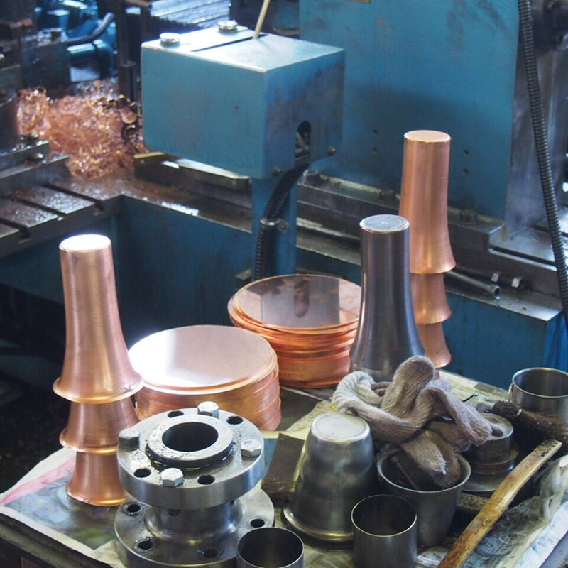 円形の銅板からゆっくりと時間をかけて引き伸ばして現在の形にし、細部にわたって何度も削り、そして丁寧に磨き上げていきます。