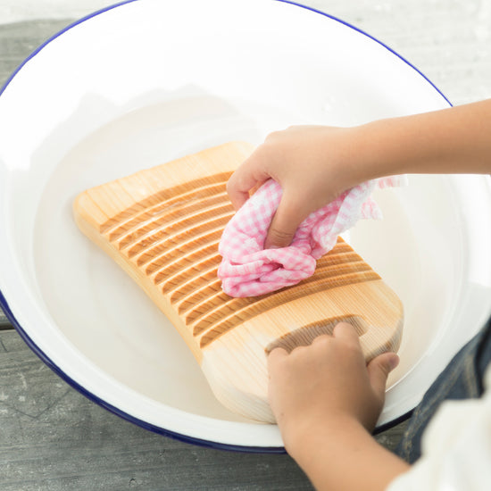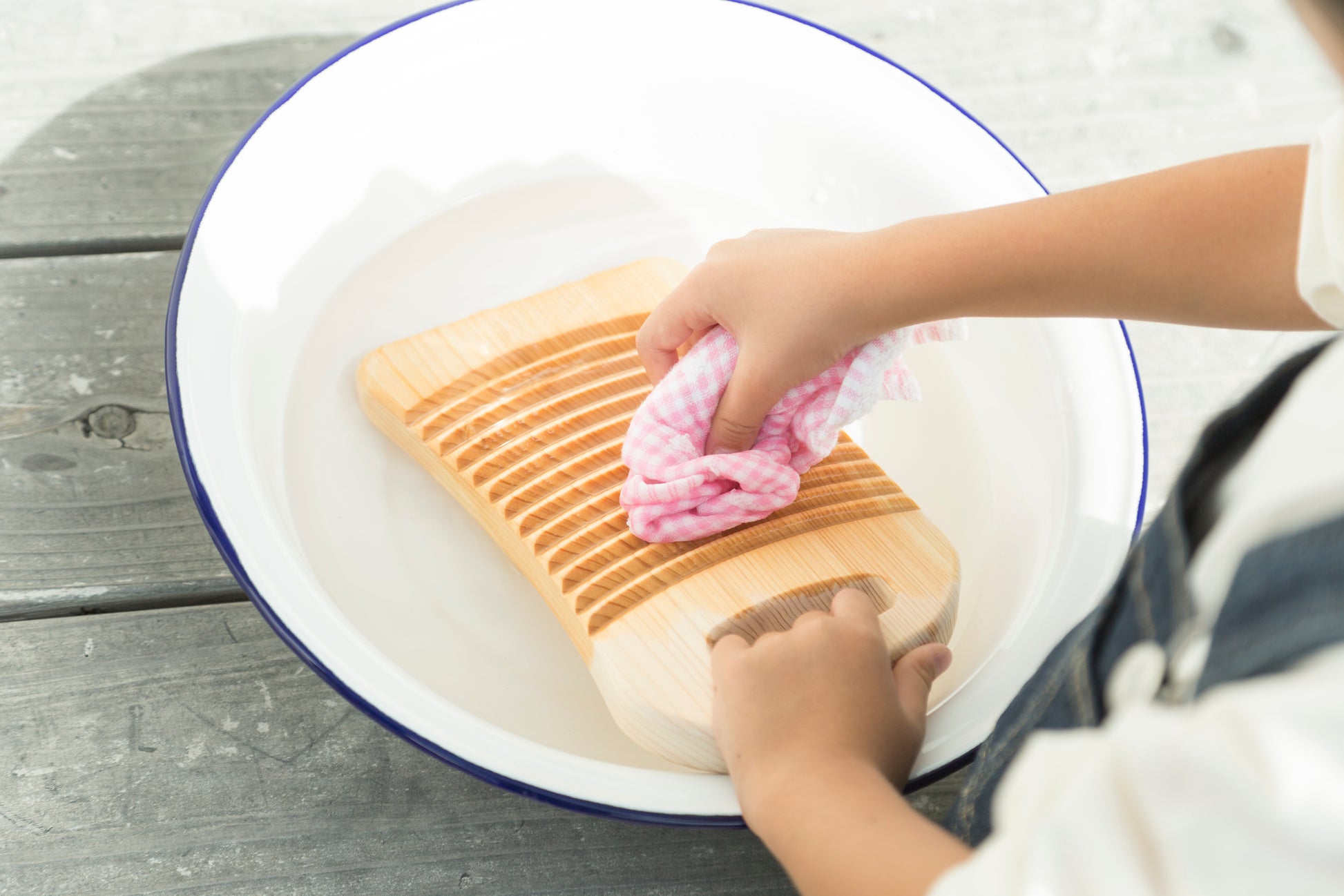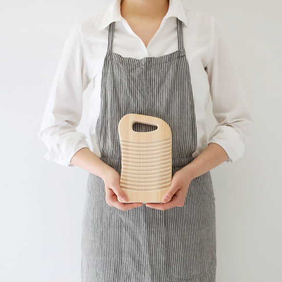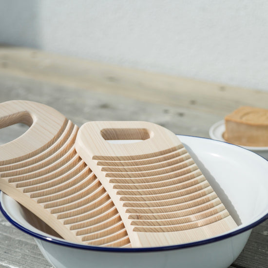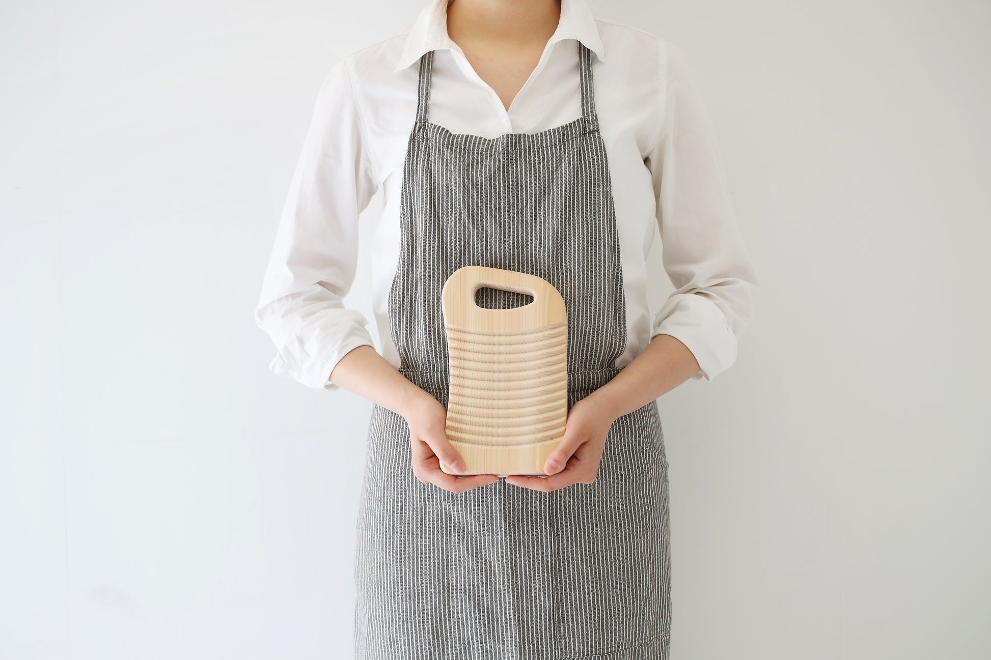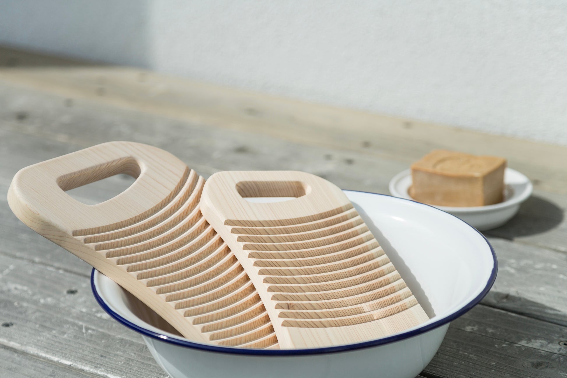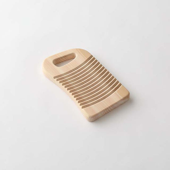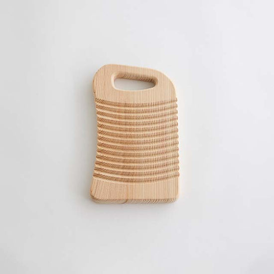 立てかけておくだけで心和むようなゆるやかなデザインの洗濯板。清々しいひのきの香りに自然と気持がほぐれていきます。落ちにくい汚れも簡単にきれいになって、一度使うと手放せなくなる暮らしの道具です。洗濯機では落としきれない部分だけ予洗いし、そのまま洗濯機に入れて洗えばスッキリきれいになります。少し上向きにカーブさせたギザギザ部分には洗剤の泡が留まりやすいため少量の洗剤で効率良く洗うことができます。